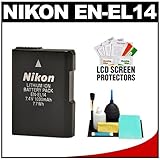 Kit includes: ♦ 1) Nikon EN-EL14 Rechargeable Li-ion Battery ♦ 2) Precision Design Deluxe 6-Piece Lens & Digital SLR Camera Cleaning Kit ♦ 3) Digital Camera LCD Monitor Screen ProtectorsProvide your camera an extra 1030mAh of power, this spare EN-EL14 will not put constraints on how you want to shoot and can be typically charged over 1000 times.
