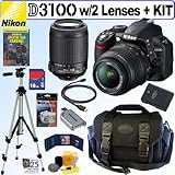 Nikon's affordable, compact and lightweight D3100 digital SLR features a high-resolution 14-megapixel CMOS DX sensor and intuitive onboard assistance including the learn-as-you grow Guide Mode. Capture beautiful pictures and amazing Full HD 1080p movies with sound and full-time autofocus.Easily capture the action with a fast start up time, split-second shutter release, 3 frames per second shooting and 11-point autofocus. Capture pictures and make movies in near darkness with an ISO range of 100 to 3200 (expandable to 12800-Hi2). EXPEED 2, Nikon's new image processing engine, assures breathtakingly rich image quality, managing color, contrast, exposure and noise. One-touch Live View and movie recording lets you see the action on the 3" monitor and the Scene Recognition System automatically chooses the ideal settings. Select from 6 Automatic Exposure Scene Modes: Portrait, Landscape, Child, Sports, Close-up or Night Portrait. Active D-Lighting restores picture-enhancing detail in shadows and highlights. A built-in pop-up flash is ready if necessary and in-camera image editing allows creative freedom and effects, without the need for a computer.Nikon AF-S DX-Nikkor 18-55mm f3.5-5.6G VR Nikkor Zoom Lens: Featuring a built-in Silent Wave Motor and Vibration Reduction (VR). The AF-S DX-Nikkor 18- 55mm f3.5-5.6G VR is an affordable, and compact, 3x zoom lens covering the most frequently used focal range of 18-55mm with amazing versatility.Nikon 55-200mm f/4-5.6G ED AF-S VR DX Zoom-Nikkon lens: with 35mm equivalent of 82-300mm * Vibration Reduction allows in-focus shots with longer exposure times (up to three shutter speeds slower) * Silent Wave Motor for fast, quiet focusing * ED (Extra-low Dispersion) glass lens element for superior optical performance * Super-integrated coating minimizes ghosting and flare for more vivid images in dim lighting.++PLUS++ 16GB Deluxe Accessory Kit: Loaded with extremely useful accessories.