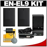 Kit includes: ♦ 1) CTA EN-EL9a Rechargeable Lithium-Ion Battery Pack ♦ 2) Additional CTA EN-EL9a Battery Pack ♦ 3) Mini Battery Charger for EN-EL9a ♦ 4) Precision Design 5-Piece Lens Cleaning KitIncrease your shooting capacity with these powerful CTA EN-EL9a Lithium-ion rechargeable batteries.