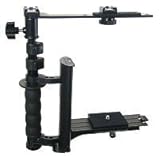 This sturdy camera flash bracket flips quickly from horizontal to vertical and maintains a consistent flash position and lens-to-flash distance, the ultimate flash accessory for event & wedding photography. Features: Height light bar supports small umbrella or softbox, horizontal shoe bar supports 2 compact flashes. Large "Quick Release" camera mount fits all digital SLRs, with universal tripod mount on bottom.