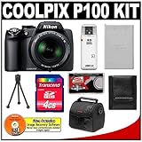 Kit includes:♦ 1) Nikon Coolpix P100 Digital Camera (Matte Black)♦ 2) Spare EN-EL5 High-Capacity Lithium-Ion Battery Pack♦ 3) Transcend 4GB HC SecureDigital (SDHC) Card♦ 4) Precision Design USB 2.0 High Speed SecureDigital (SD/SDHC) Card Reader♦ 5) Image Recall Digital Image Recovery Software♦ 6) Precision Design PD-C10 Deluxe Carrying Case ♦ 7) Precision Design Memory Card Storage Wallet♦ 8) Precision Design Flexible Tabletop Mini Tripod♦ 9) Cameta Microfiber Cleaning Cloth