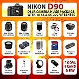 THIS PACKAGE INCLUDES: Nikon 18-55m f3.5-5.6G VR Lens Nikon 55-200mm f3.5-5.6G ED AF-S VR Lens 32GB SDHC Memory Card + Memory Card Reader 2 Extra Extended Life Batteries + Battery Charger Wide Angle Lens + 2x Telephoto Lens + Filter Kit Digital Flash Soft Deluxe Carrying Case Medium Size Tripod Hard Tulip Lens Hood Wireless Remote Control The Nikon D90 SLR Digital Camera, with its 12.3-megapixel DX-format CMOS, 3" High resolution LCD display, Scene Recognition System, Picture Control, Active D-Lighting, and one-button Live View, provides photo enthusiasts with the image quality and performance they need to pursue their own vision while still being intuitive enough for use as an everyday camera. It features Nikon's EXPEED image processing engine to deliver outstanding images featuring fine details, smooth tones, rich colors and low noise across a wide ISO sensitivity range, and significantly accelerate camera performance on all levels. With a start up time of just 0.15 seconds and a shutter release lag time of approx. 65 milliseconds, the D90 delivers instant response, and provides continuous shooting at a rapid 4.5 frames per second. In addition, the D90 introduces the D-Movie mode, allowing for the first time, an interchangeable lens SLR camera that is capable of recording 720p HD movie clips. The Nikon D90 lets users take advantage of the superior optical quality and broad selection of available NIKKOR lenses, and the refined 11-area AF System (based on Nikon's advanced Multi-CAM 1000 AF Sensor Module) ensures consistently fast and precise focus lock in various shooting conditions while Nikon's exclusive 3D Color Matrix Metering II ensures accurate automatic exposure control, even in the most challenging lighting conditions.
