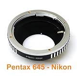 * This adapter allows you to use Pentax 645 Lens on Nikon cameras. * Precisely Made of Brass * Allow focus to Infinity. * It has no glass element so no effect to optical perferformance. * Manual control supported Please Note: * Autofocus (AF) is not available; and * The distance scale on the lens maybe different from the actual focus distance.Compatible: D3x, D3s, D3, D700, D300s, D300, D200, D100, D90, D80, D70s, D60, D40x, D50, D5000, D3000, Fuji S5 Pro, S3 Pro etc. Fits Pentax 645 Mount LensPackage Include*Pentax 645 Lens To Nikon Adapter x 1Instruction1) Mount the lens to the adapter first.2) Mount the combination of lens and adapter to camera.3) To remove, please remove the combination of lens and adapter from the camera.