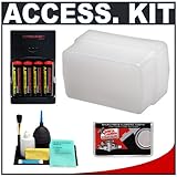 Kit includes: ♦ 1) Zeikos Omni-Bounce Flash Diffuser♦ 2) Precision Design 4 NiMH Batteries with Rapid Charger♦ 3) Precision Design Deluxe 6 Piece Lens & Digital SLR Cleaning Kit♦ 4) Cameta Microfiber Cleaning Cloth