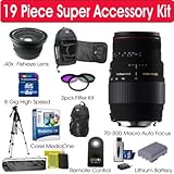 19 PIECE SUPER ACCESSORY KIT INCLUDES:1. Sigma 70-300MM Zoom Lens with Macro 2. Corel MediaOne Plus Software3. 8 GB High Speed Memory Card 4. Wireless Remote Control5. High Speed Card Reader 6. Premier Back Pack Camera Case 7. High Capacity Lithium Ion Battery8. Professional High Definition Super Wide .42x Fisheye Lens9. Multi-Coated 3 Piece Filter Kit10. 50" Aluminum Tripod11. Tripod Carrying Case12. Deluxe Camera Shoulder Strap13. Universal Screen Protectors14. Cotton Swabs15. Fiber Cloth16. Lens Cleaning Fluid17. Blower Brush18. Lens Tissues19. 110/220 Volt AdapterThe Sigma 70-300MM zoom lens with Macro attaches directly to the front of your camera lens enabling you to begin shooting immediately. It is a high-performance lens ideal for portraits, sports photography, nature photography. This lens has been perfectly optimized with use for Digital SLR cameras. The multi-layer lens coating and lens design reduces flare and ghosting. The lens features a 1:2 maximum close-up magnification at the 300 millimeter focal length.The lens features SLD (Special Low Dispersion) glass for excellent correction of chromatic aberration. The perfect addition to any photographers arsenal. The 19 Piece Super Camera Accessory Kit is compatible with: Nikon D3000 Digital SLR Camera