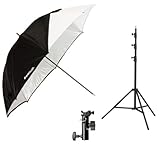 When portability matters, this kit delivers.Designed to fit into a backpack, the included 43" umbrella has a telescoping shaft, yet offers a full 43" spread. Collapsed size is only 14.5".The umbrella is made of a high-quality white diffusion material perfect for diffusing harsh light.In addition, a black removable cover is included.When this cover is attached to the umbrella, it offers an ideal bounce light source for any style studio lighting.The included adjustable shoe mountfits a variety of off-camera flash units.All metal construction provides added strength. The included 8' lightstand is durable yet lightweight.Perfect for travel.